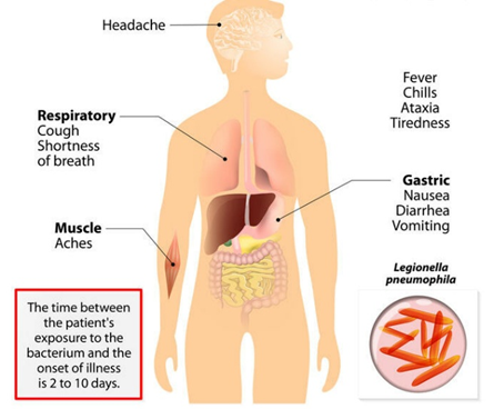 Aunque la bacteria no representa una amenaza en las aguas naturales, se vuelve problemática cuando comienza a contaminar los sistemas de agua en edificios más grandes como hospitales, hoteles, oficinas e instalaciones industriales. Cuando el agua de estos sistemas crea gotas o niebla, las personas pueden inhalar fácilmente las bacterias e infectarse.
